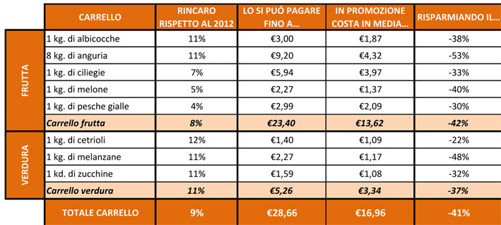 Anche nel reparto ortofrutta, però, l’acquisto in promozione consentirebbe di ridurre il costo di una spesa tipo per una famiglia media – composta esclusivamente da frutta e verdura di stagione – da circa 29 euro a 17 euro, ottenendo così un risparmio che supera il 40 per cento. Per alcuni prodotti, anzi, le opportunità di risparmio possono arrivare fino al 50%, specie per quelli con i rincari maggiori: per esempio, il costo al kg delle angurie può scendere da 1,15 euro a poco più di 50 centesimi e quello delle melanzane da 2,27 a 1,17 euro.