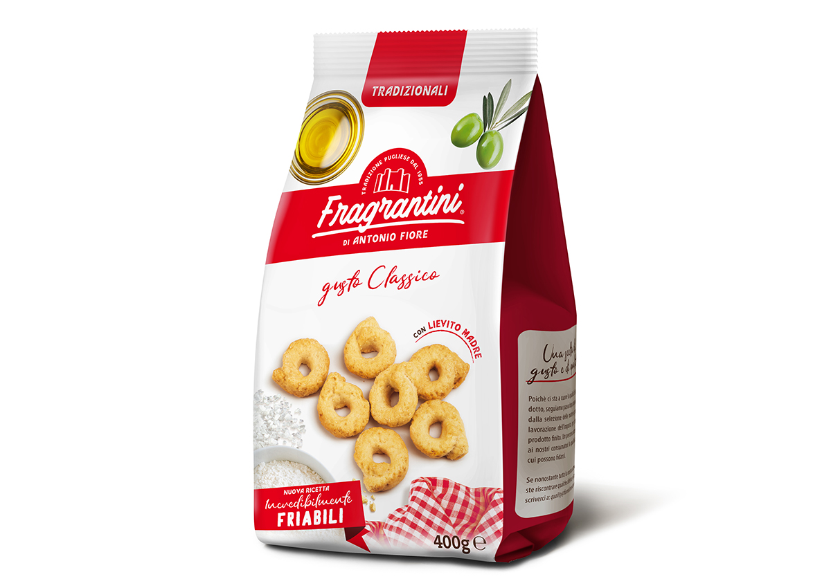 Fragrantini di Antonio Fiore: tarallini pugliesi tradizionali, gusto classico. Snack salato friabile da forno.