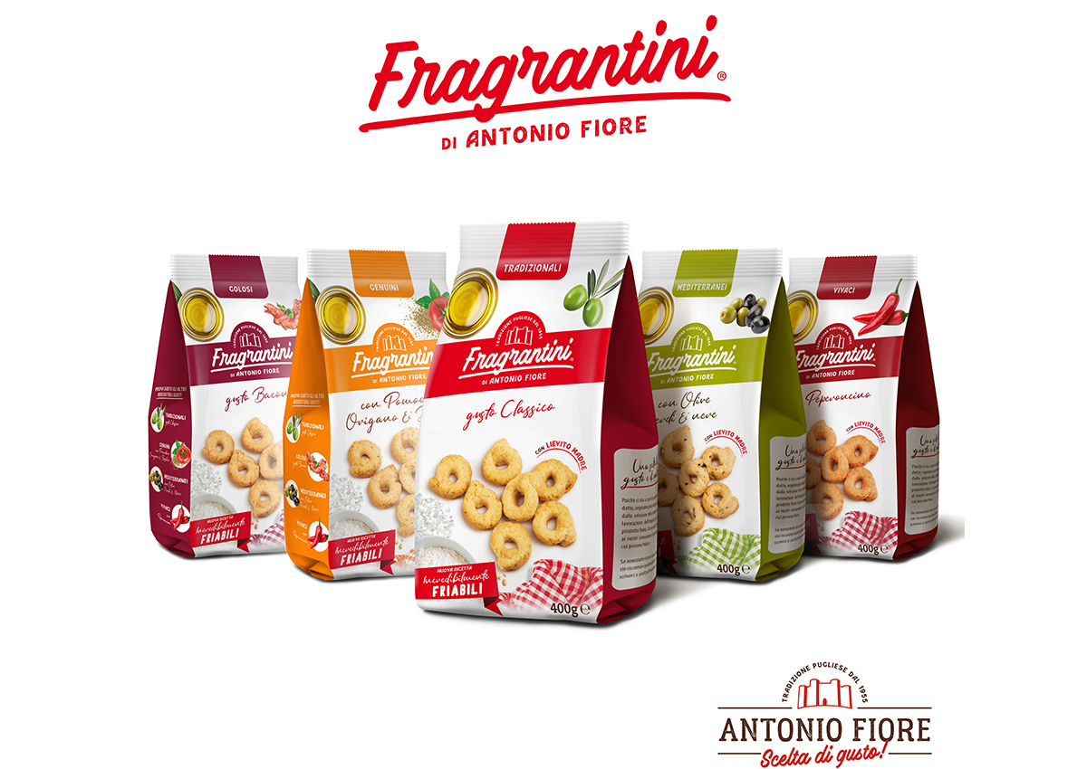Assortimento Fragrantini Antonio Fiore. Tarallini friabili in confezioni colorate con diversi gusti. Snack pugliese tradizionale.